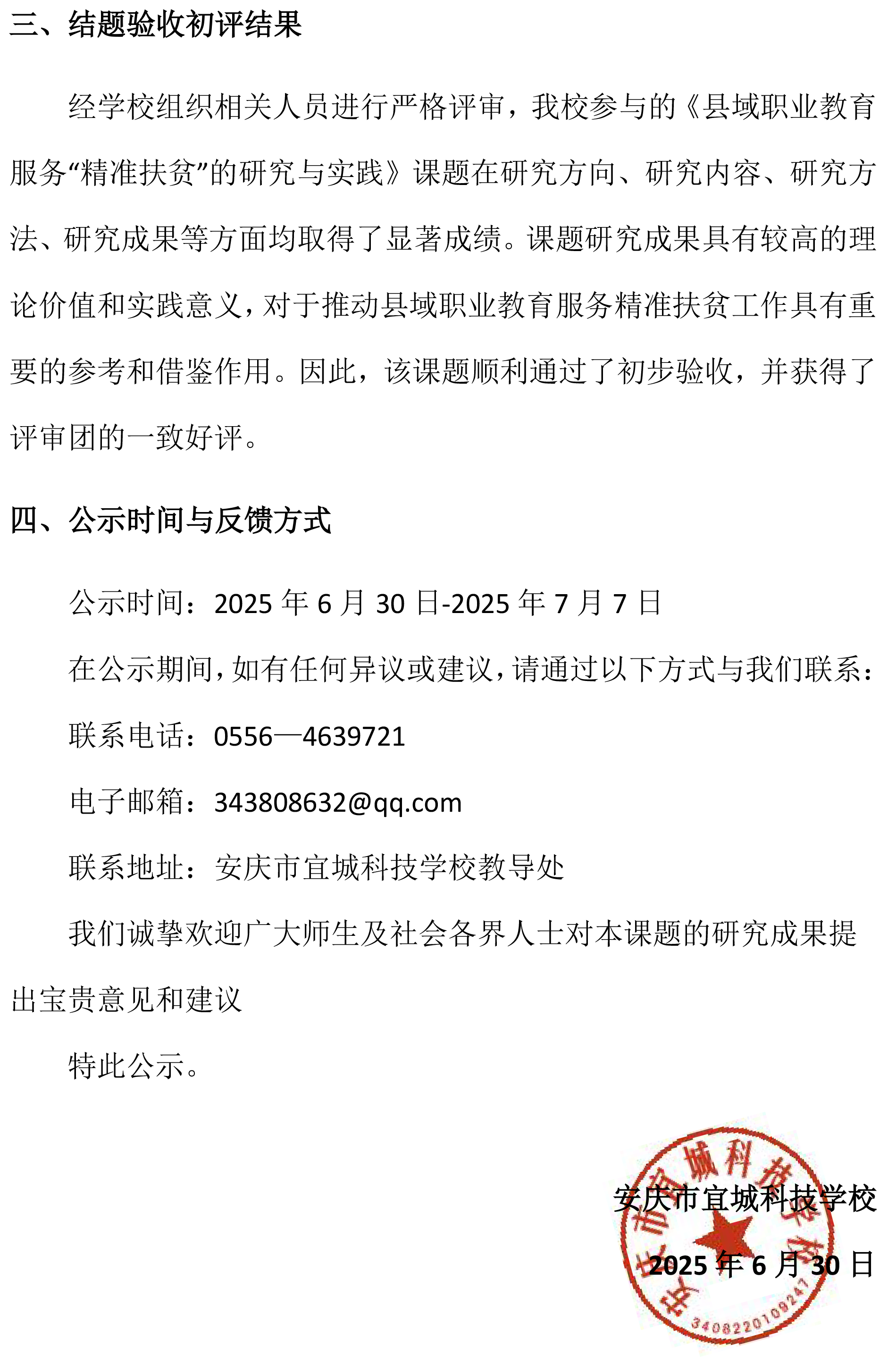 關(guān)于《縣域職業(yè)教育服務(wù)“精準(zhǔn)扶貧”的研究與實(shí)踐》課題結(jié)題驗(yàn)收初評(píng)結(jié)果公示
