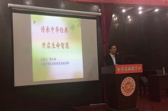 為推動學校的誦讀經(jīng)典教育,引領(lǐng)一方讀經(jīng)風氣,創(chuàng)建書香校園、文化校園,走進國學經(jīng)典創(chuàng)造豐厚人生。2017年4月20日晚,河南道中書院高級講師陳億挺老師“讀經(jīng)宣導懷寧行”來到懷寧縣職教中心。在該??萍即髽且粯菆蟾鎻d開展了“相約論語一百,啟發(fā)原創(chuàng)心靈”讀經(jīng)教育講座。本次也是陳老師巡回演講中的第122場,該校高一600多名師生參與活動。