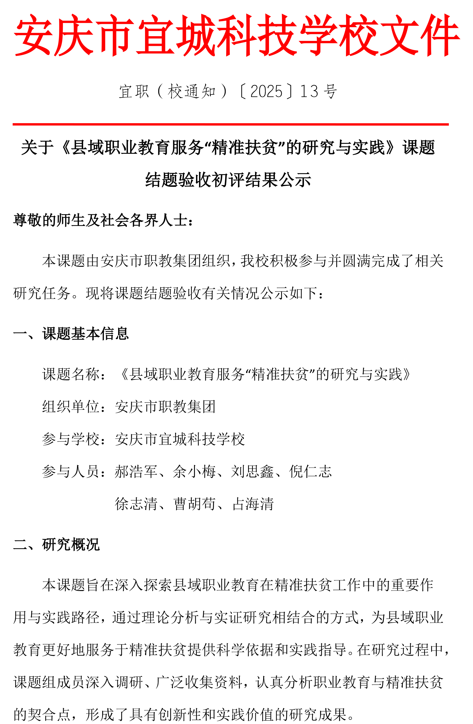 關(guān)于《縣域職業(yè)教育服務(wù)“精準(zhǔn)扶貧”的研究與實(shí)踐》課題結(jié)題驗(yàn)收初評(píng)結(jié)果公示
